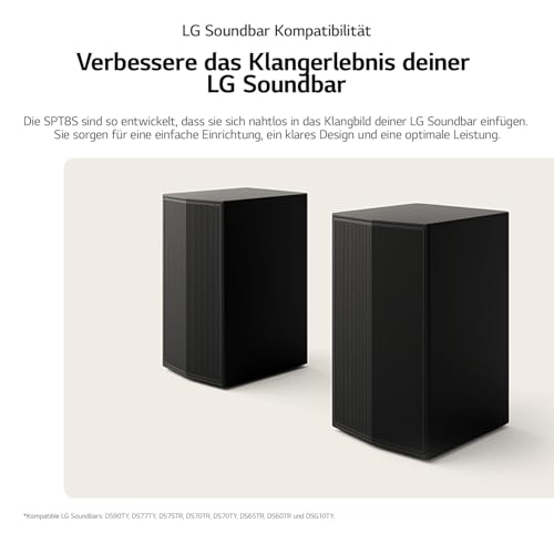 Wenn Du Deine Soundbar gezielt zur Heimkino-Lösung ausbauen möchtest, ist das LG SPT8-S Rücklautsprecher-Set für Soundbars eine überzeugende Wahl. Es liefert mit zusätzlichen 100 W genau dort Mehrleistung, wo Soundbars alleine oft an ihre Grenzen stoßen: bei der räumlichen Abbildung hinter Dir. Das Resultat ist ein deutlich intensiveres Surround-Erlebnis, ohne dass Du viel Platz opfern musst.