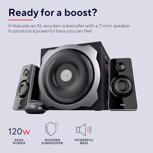 Erlebe satten, tiefen Sound und spürbare Bässe in deinem Zuhause: Das Trust Tytan 2.1 Lautsprecher Set mit Subwoofer kombiniert einen leistungsstarken 7‑Zoll‑Subwoofer mit 120 Watt Spitzenleistung – für ein verbessertes Klangerlebnis bei Filmen, Musik und Games, das du flexibel nach deinen Wünschen anpasst.