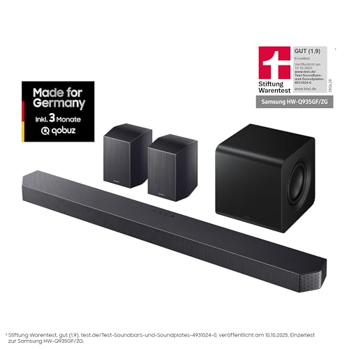Wenn du eine Samsung Soundbar kaufen möchtest, die dir echten Heimkino-Charakter mit minimalem Kabelaufwand liefert, ist die SAMSUNG HW-Q935GF Q-Series Soundbar mit Subwoofer eine empfehlenswerte Wahl. Die 9.1.4-Kanal-Abbildung in Kombination mit kabellosem Dolby Atmos adressiert genau die Anforderungen, die viele Wohnzimmer-Setups stellen: maximale Immersion, schlanke Installation, dezente Optik.