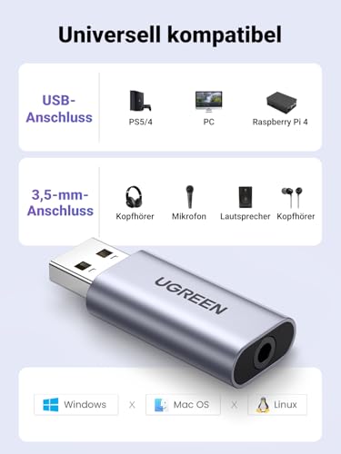 Die UGREEN USB Externe Soundkarte 2 in 1 bringt Dir eine einfache, schnelle und hochwertige Lösung für Audio- und Mikrofoneingänge – ideal, wenn Du ohne großen Aufwand besseren Klang und klare Sprachübertragung über USB nutzen willst, zum Beispiel am Laptop oder an der PS4.