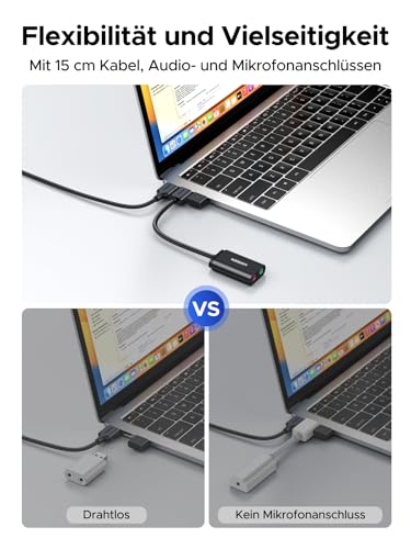 Die UGREEN externe USB Soundkarte verwandelt Ihren Computer in eine hochwertige Audiolösung. Genießen Sie klare Klänge und einfache Plug-and-Play-Nutzung ohne zusätzliche Treiber.